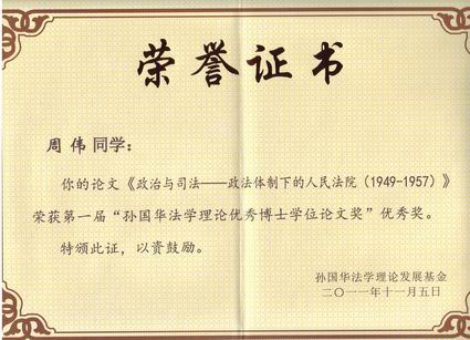高其才教授指导的、2011届法理学专业博士毕业生周伟的学位论文《政治与司法——政法体制下的人民法院(1949-1957) 》荣获“孙国华法学理论优秀博士学位论文奖”优秀奖。