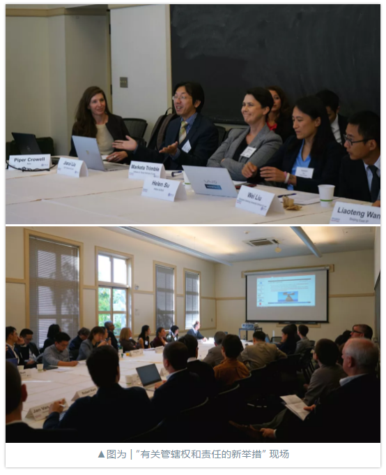 知识产权与科技法中心主任刘家瑞分享了跨境著作权实施。东方亿思知识产权代理公司硅谷办公室合伙人王燎腾从管辖权角度看待了中国知识产权诉讼,他指出中国正在经历一场知识产权诉讼热潮,越来越多的知识产权法庭被设立。内华达大学拉斯维加斯分校教授Marketa Trimble主讲了贸易的公平实施与知识产权执行。Alston&Bird律师事务所合伙人Helen Su分享了抗辩与外国主权豁免法令。Harris Bricken律师事务所的Dan Harris律师从社会信用和负债延迟方面指出外国人在中国也有相应风险。
